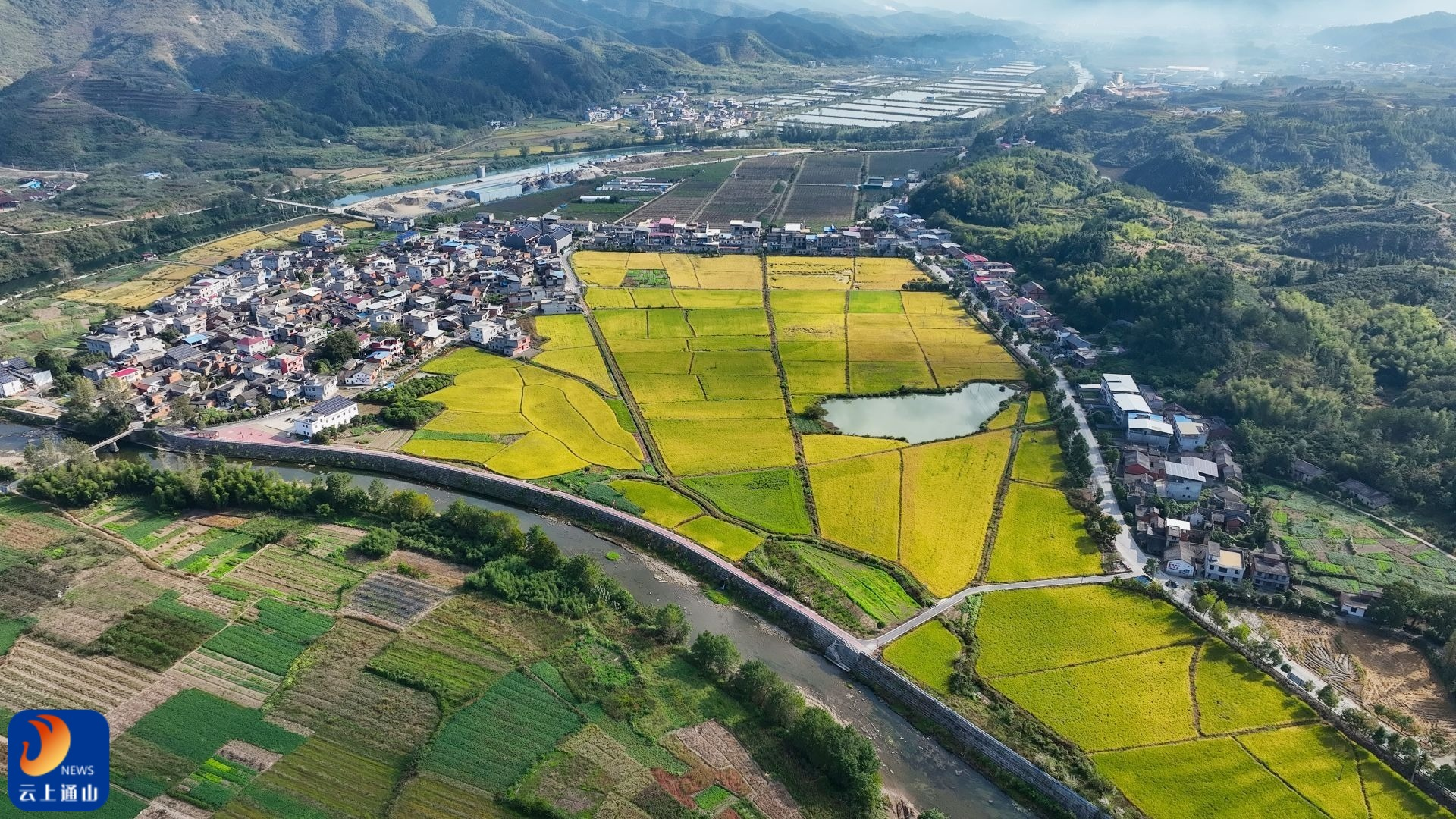 ▲通山县闯王镇汪家畈村,稻田铺展如金毯,村落、河流与远山相映,绘就乡村振兴的美好图景。