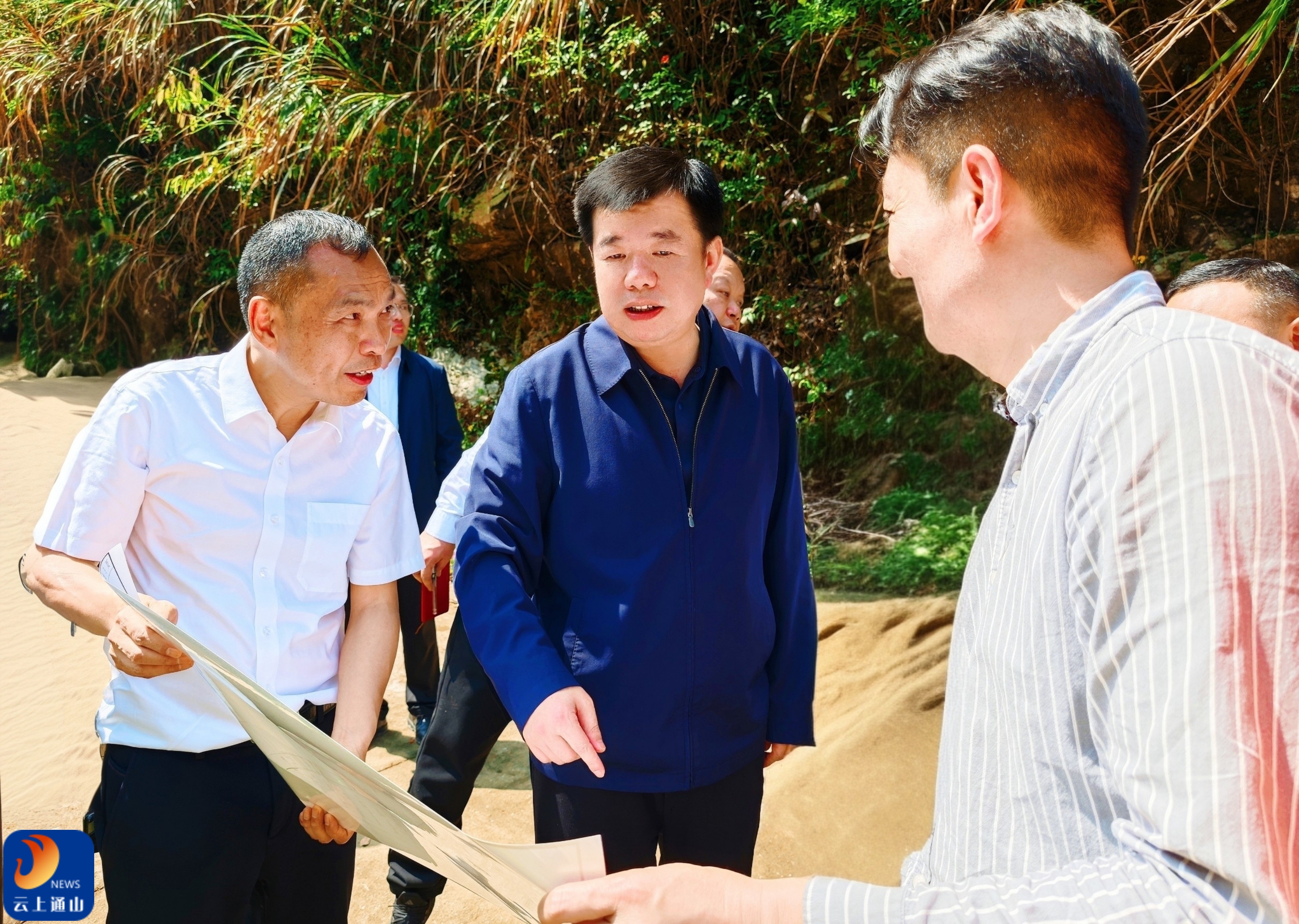 ▲吴涛、王功辉一行实地察看移民安置、管网铺设、大坝浇筑、砂石保供及路桥建设进展。
