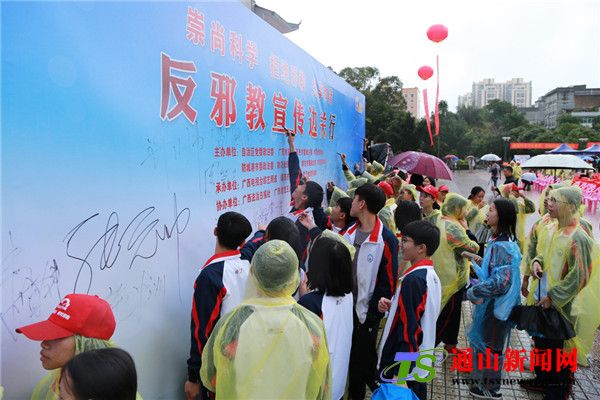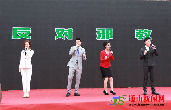 此次由广西电视台具体组织的演出活动,以“崇尚科学、拒绝邪教、共享和谐”为主题,通过歌舞、山歌对唱、小品、朗诵、快板,歌颂改革开放40年祖国处处繁荣昌盛,宣传反邪教知识和打击邪教犯罪的法律法规,反映广大人民群众“崇尚科学,反对邪教”的心声,表达全民创造和谐稳定社会环境实现伟大的中国梦的强烈愿望。“壮乡歌后”黄春艳、“中国变脸王子”卫东、广西青年歌手贾剑龙的倾情演出,加上充满当地壮乡特色的节目,让5000多观众情绪高涨,现场高潮迭起,掌声不断。而中间穿插的反邪教知识有奖问答,又充分调动了观众热情和积极参与,整个广场一片沸腾。演出过程中,主持人宣读《反邪教倡议书》,观众走上舞台,在反邪教宣传墙上签名。