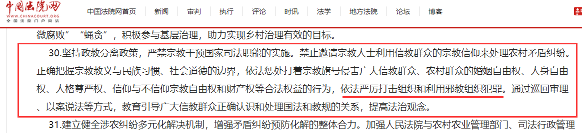 中国反邪教网讯(记者厉洁)11月7日,最高人民法院发布《最高人民法院关于为实施乡村振兴战略提供司法服务和保障的意见》(以下简称《意见》)。《意见》明确提出,坚持政教分离政策,严禁宗教干预国家司法事务;依法严厉打击组织和利用邪教组织犯罪。