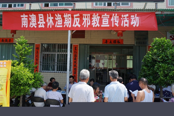 针对渔民出海作业时间长的特点,7月至9月份,县委防范办联合县委政法委、县反邪教协会,利用休渔期空档时间,先后到宅镇城、云澳镇、深澳镇等渔民较多的地区开展反邪教宣传活动。通过集中培训的形式,邀请市法制学校老师面对本岛渔民开展授课,向渔民普及反邪教知识。县委防范办还向参训的渔民发放了《反邪教宣传教育手册》《南澳县反邪教基层工作画册》《反邪教宣传卡片》等宣传资料,并赠送一批反邪教宣传雨伞,实现反邪教知识进村入户。