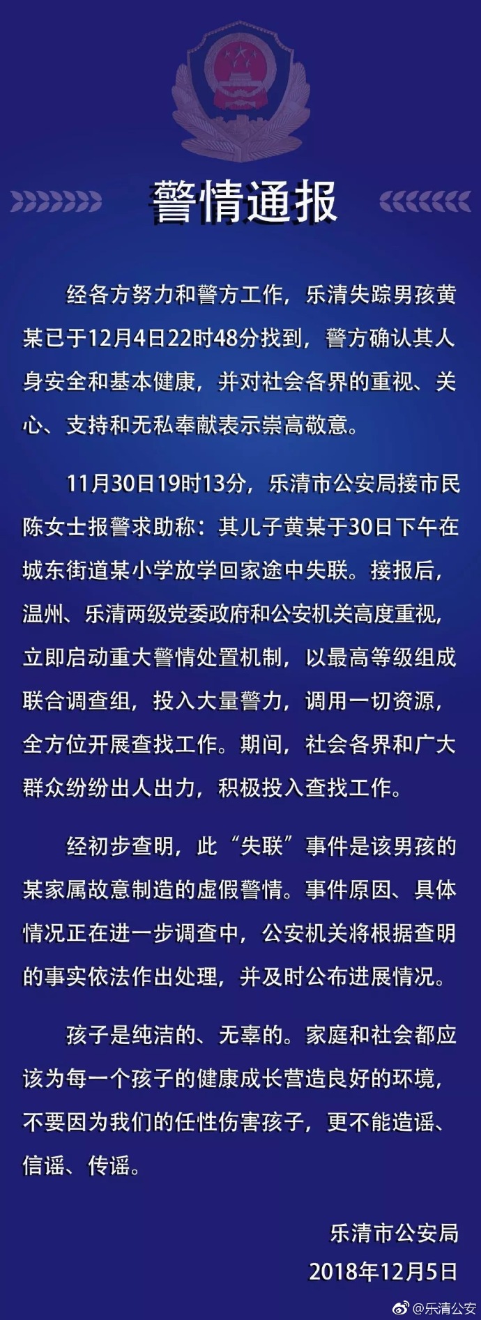 浙江省乐清市公安局官方微博5日凌晨发布警情通报称,经各方努力和警方工作,乐清失踪男孩黄某已于12月4日22时48分找到,警方确认其人身安全和基本健康,并对社会各界的重视、关心、支持和无私奉献表示崇高敬意。