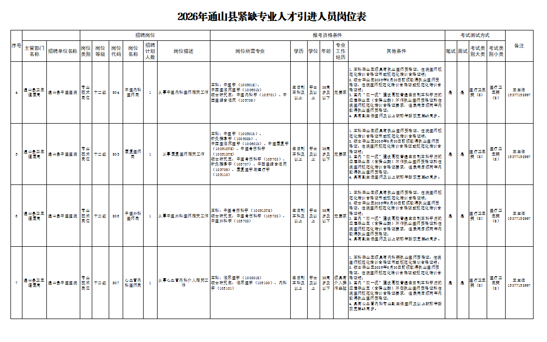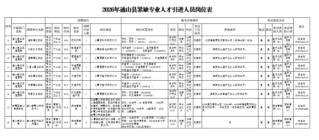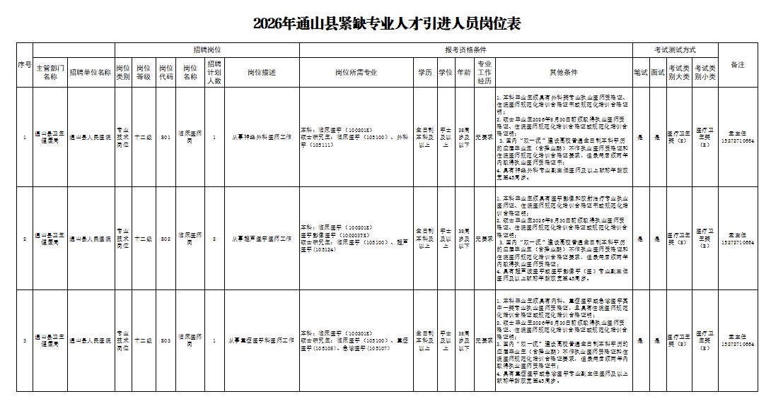 附件:1.2026年通山县紧缺专业人才引进岗位表