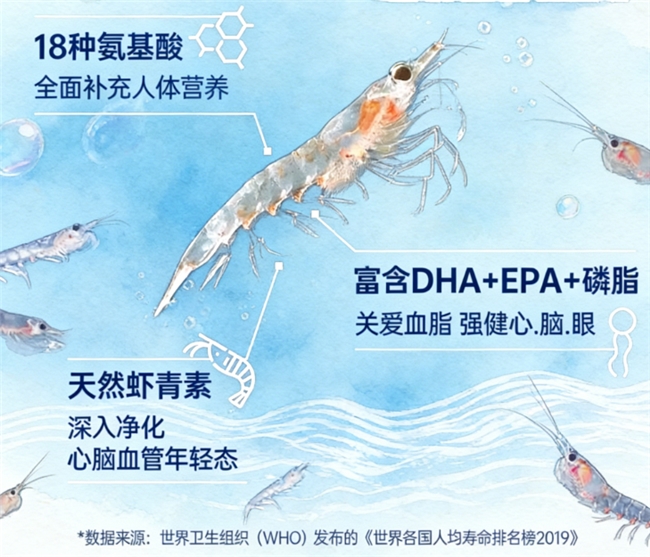 核心亮点: 南极鲜活磷虾,50%高含量海洋磷脂,特别添加多烯鱼油提升吸收率,228mg/kg天然虾青素,蓝帽认证品质保障。