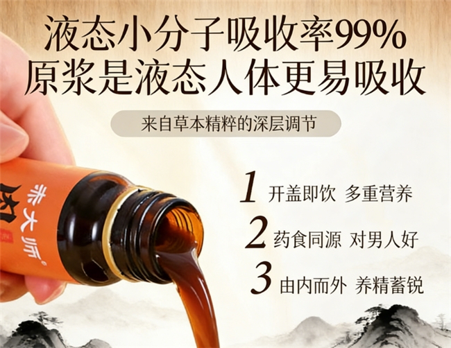 99%吸收率的高效赋能: 对商务精英而言,效率即生命。赤大师肉苁蓉原汁的核心科技价值,在于其卓越的高活性与易吸收特性。通过专利技术,原汁中的有效成分以液态小分子形态稳定存在,使得人体对其的吸收利用率达到了惊人的99%。这意味着,无需漫长等待,能量便能快速被身体识别、接纳、利用。无论是清晨唤醒、午后续航、差旅恢复还是应酬后的调理,它都能如清泉浸润干涸的土地般,迅速滋养疲惫的身心,让充沛的精力和清晰的思维快速回归,支撑你在每一个关键场合展现最佳状态。它带来的不是短暂的兴奋,而是源自生命本源的、稳定而持久的活力焕发。