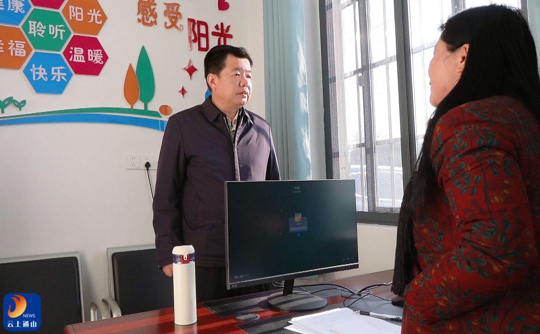 ▲吴涛与心理辅导老师深入交谈,详细了解日常工作开展模式和与学生互动的方式。