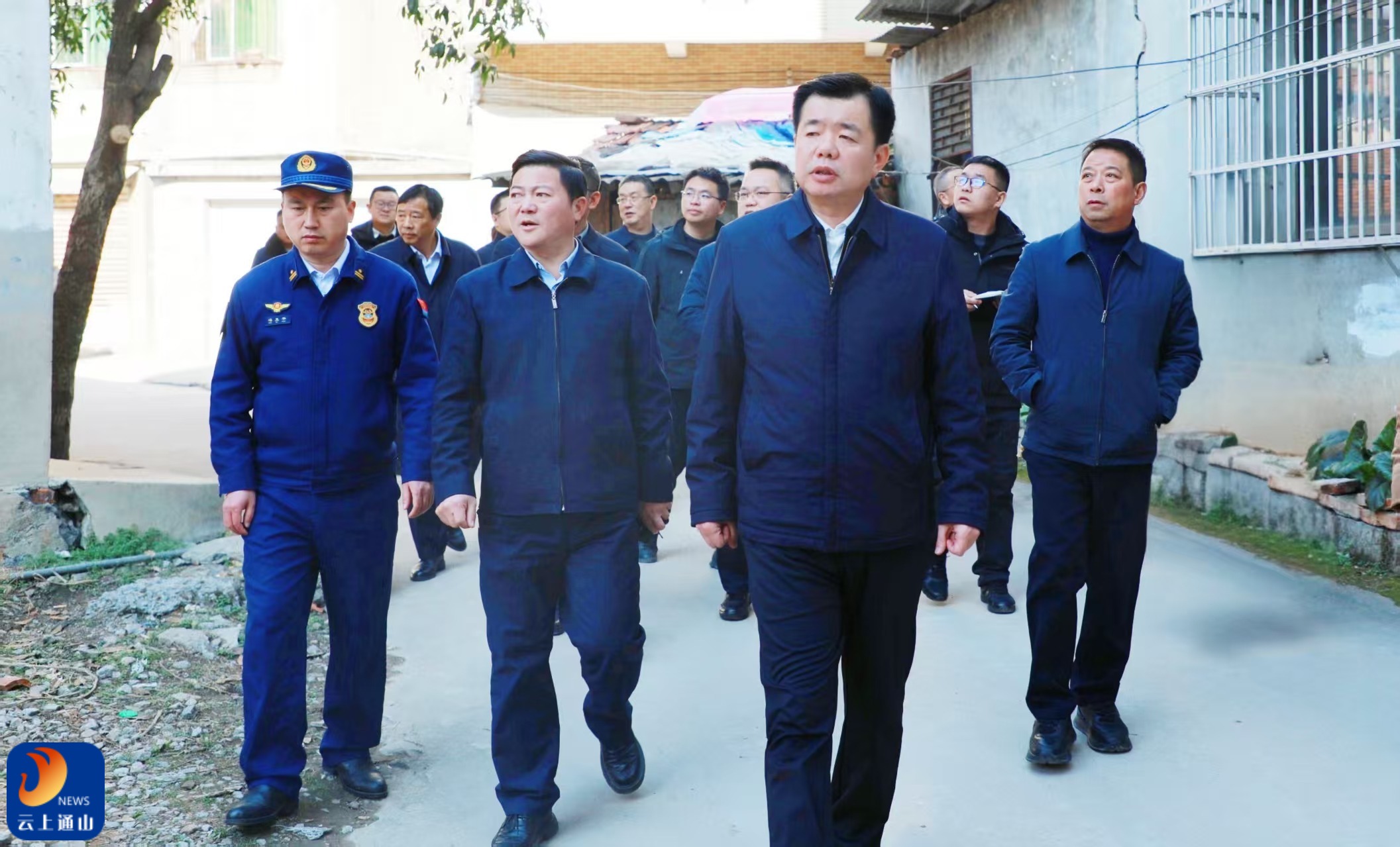 ▲吴涛一行沿街巷细致察看环境整治、基础设施完善及安全隐患排查情况。