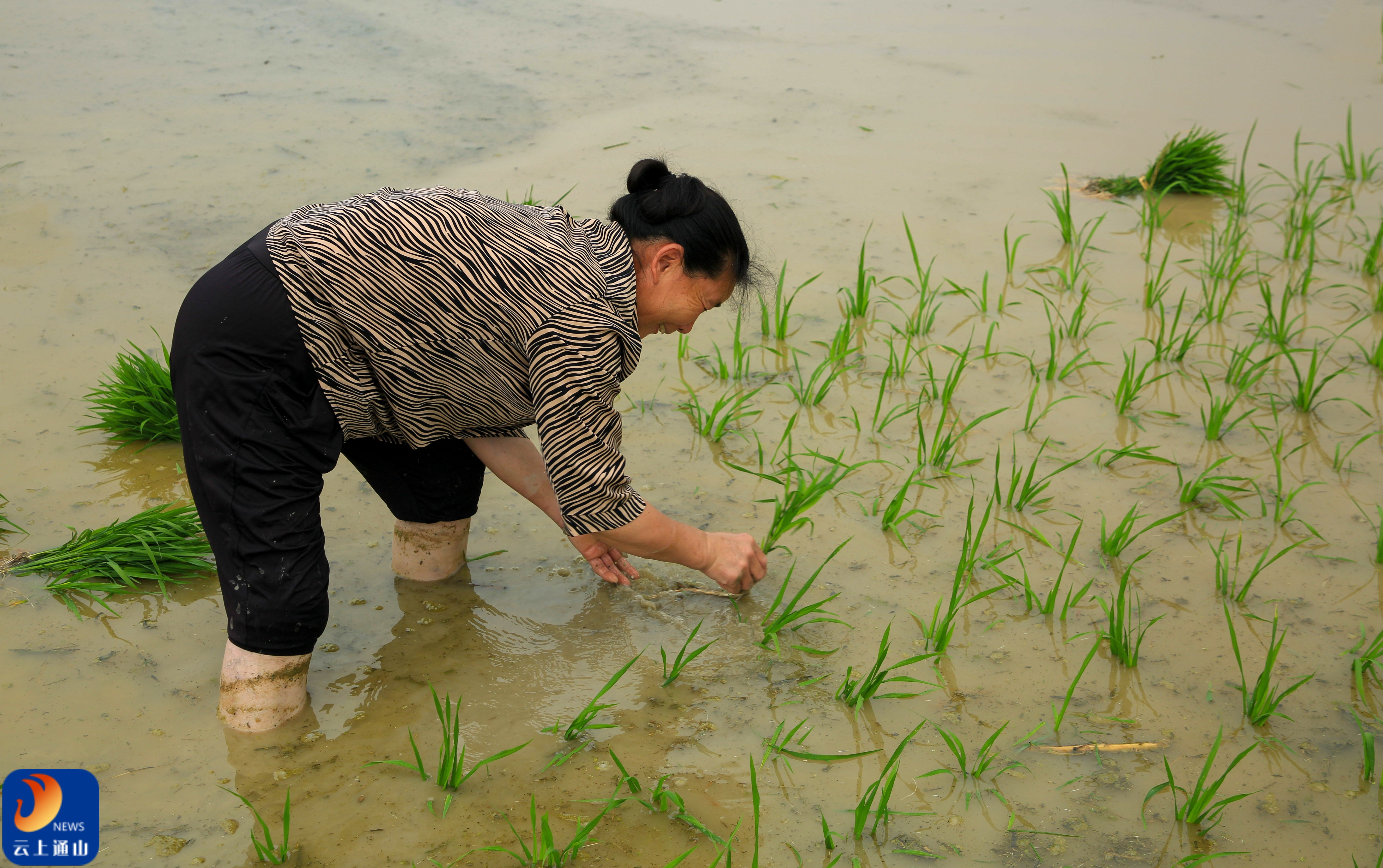 ▲农人挽着裤脚,弯着腰在稻田里将秧苗一根根栽好。
