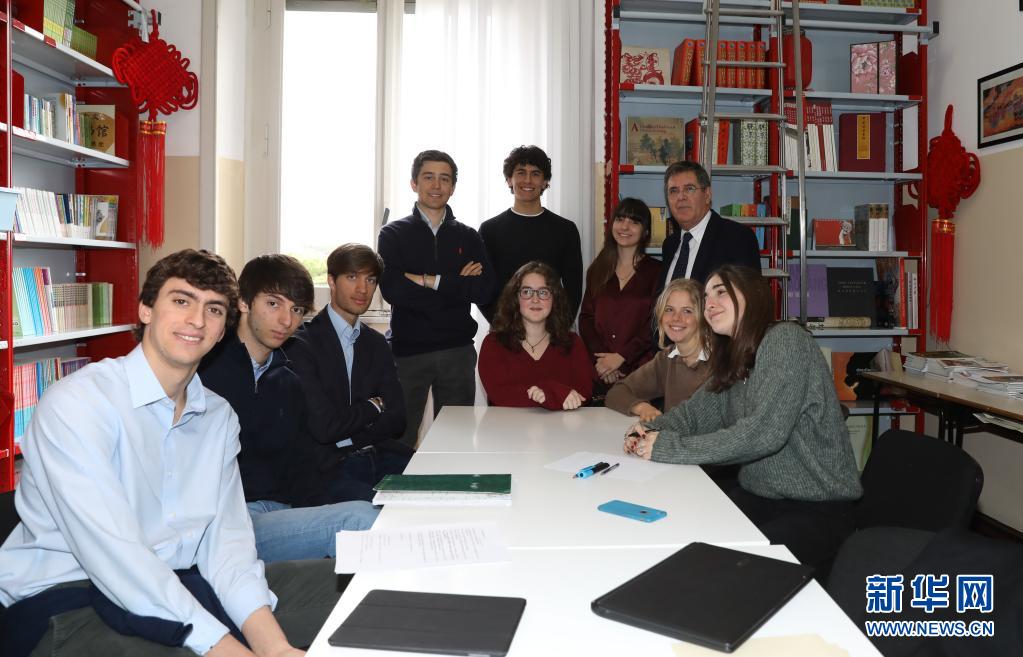 意大利罗马国立住读学校校长雷亚莱(后排右一)与致信习近平主席的学生们在一起(2019年3月18日摄)。新华社记者 程婷婷 摄