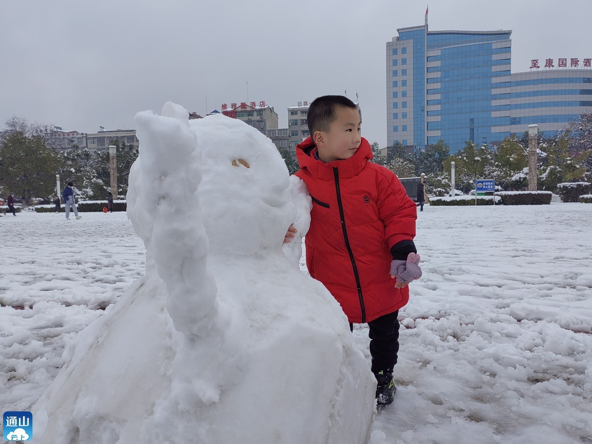 天空雪花飞舞,但是孩子们却不顾低温, 在户外打雪仗,堆雪人,追逐、嬉戏,热火朝天,把整个城市都“点燃了”!