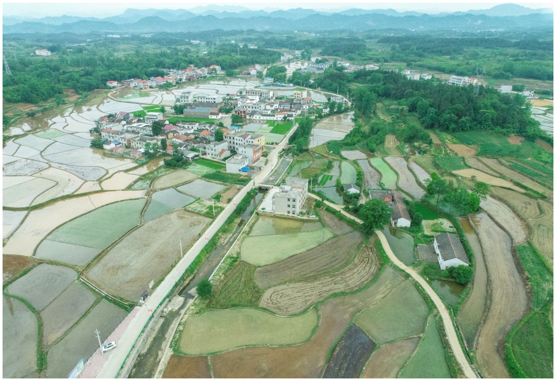 在通山县大路乡杨狮坑村,田间村民们正忙着耙田、施肥、栽秧等,一副生机盎然的图景映入眼帘。转眼间,一块块空荡荡的水田换上了“绿色”新装,如镜的水面、嫩绿的秧苗、漂亮的民居共同勾勒出一幅静好的田园风光画。