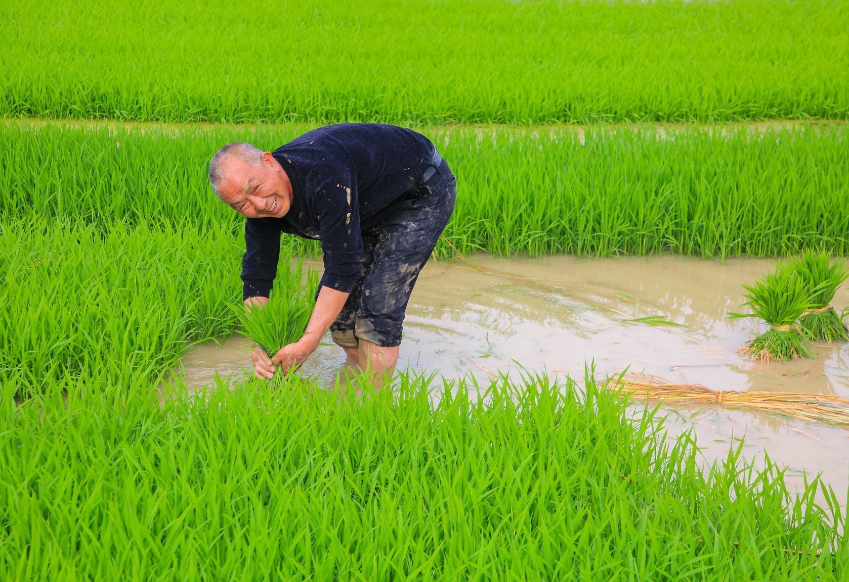 ▲田间正在栽秧的工人正弯着腰,熟练地将秧苗插入田中,为秋日的丰收打基础、作准备。