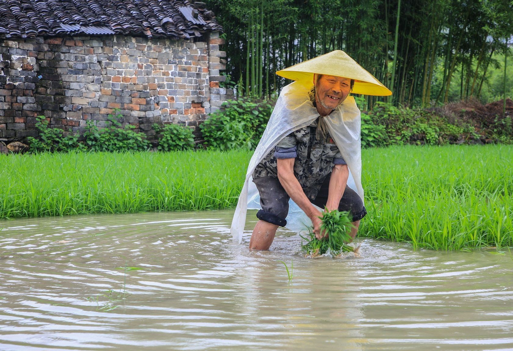 ▲这几天,阴雨绵绵,一眼望去,农户们着雨衣,正在挑秧、抛秧、栽秧,抢种单季稻,田间地头呈现出一派繁忙景象。