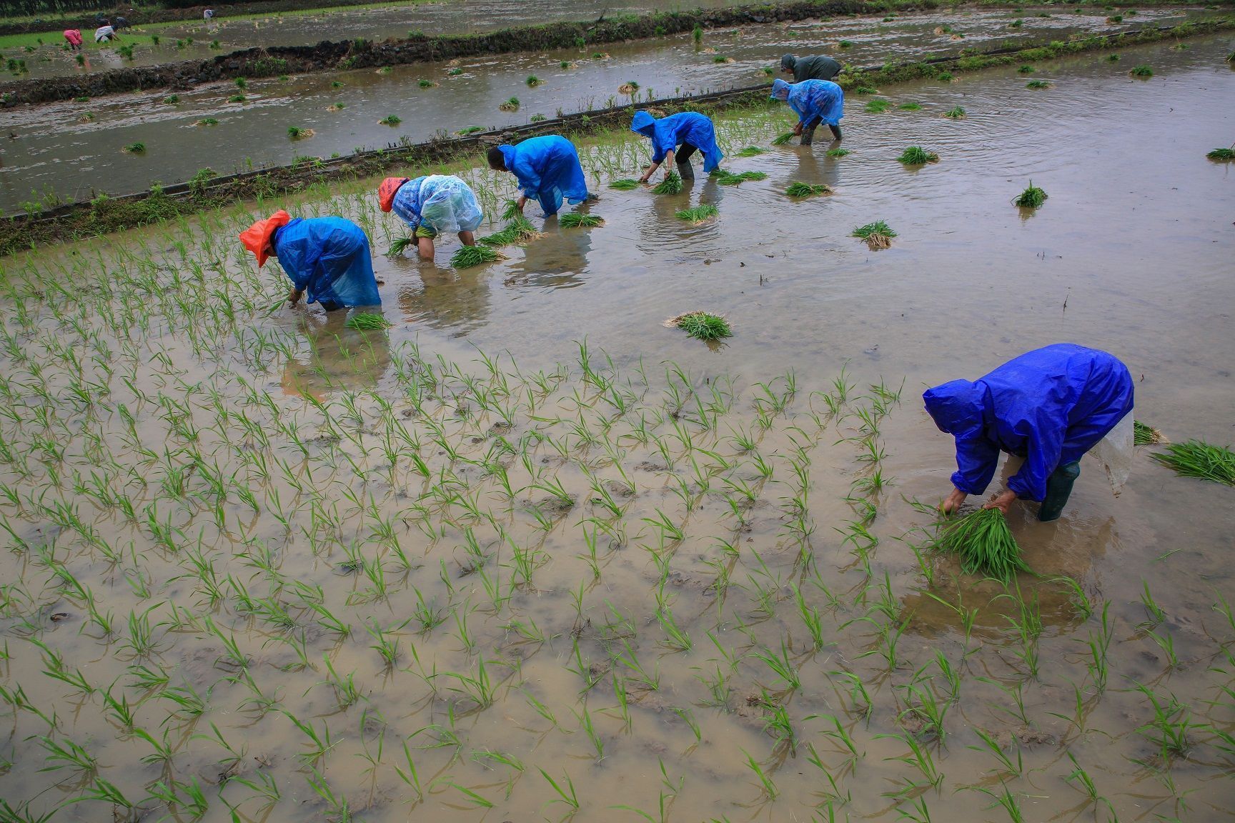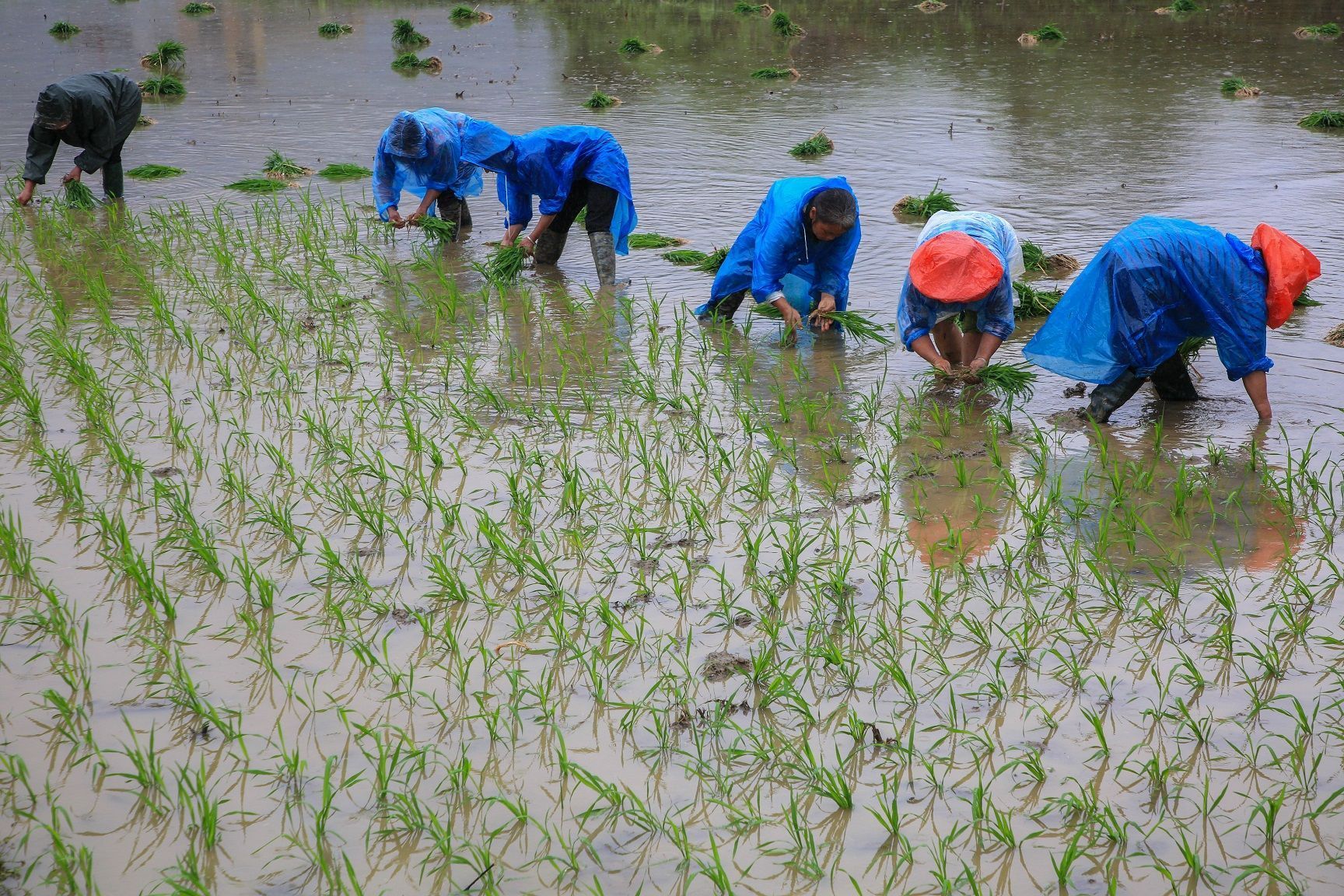 ▲这几天,阴雨绵绵,一眼望去,农户们着雨衣,正在挑秧、抛秧、栽秧,抢种单季稻,田间地头呈现出一派繁忙景象。