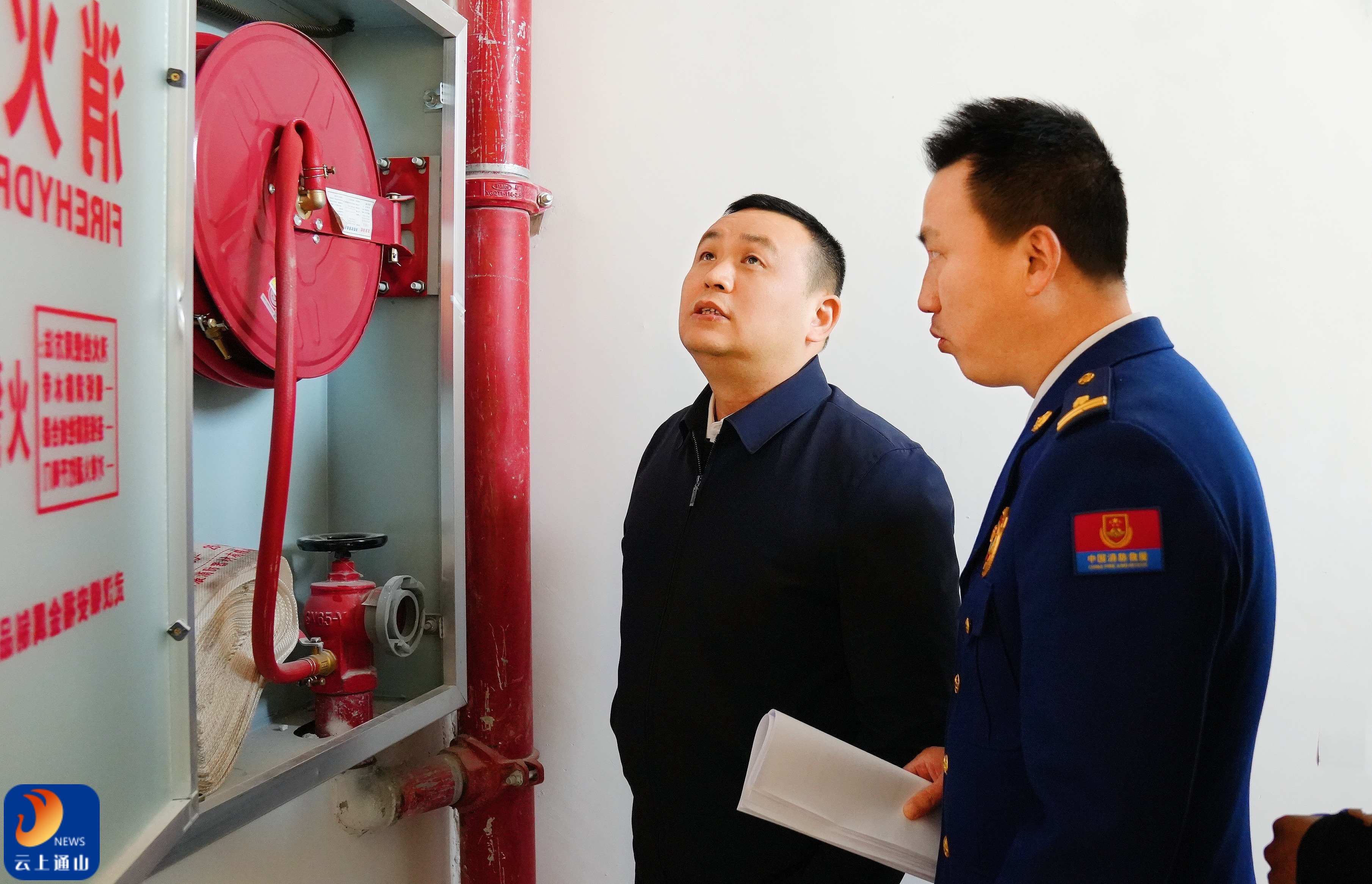 ▲王功辉详细检查了消防通道是否畅通、室内消火栓和消防器材能否正常使用等情况。