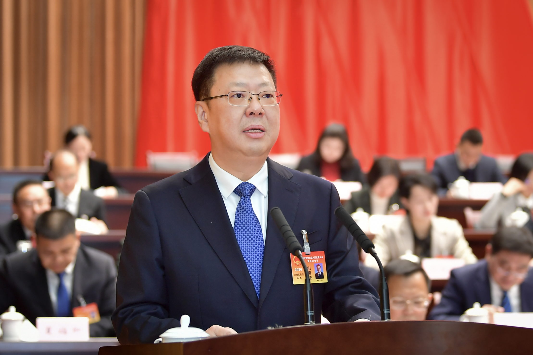 在热烈的掌声中,市长杨军向大会作政府工作报告。报告分为四个部分:一是“十四五”时期和2025年工作回顾;二是“十五五”时期发展的主要安排;三是2026年重点工作;四是加强政府自身建设。