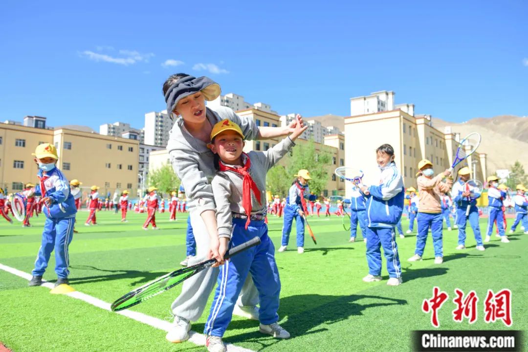 西藏自治区“2022年网球进校园活动”活动在拉萨市柳梧新区红军小学举办,网球教练指导学生练习打网球。贡嘎来松 摄