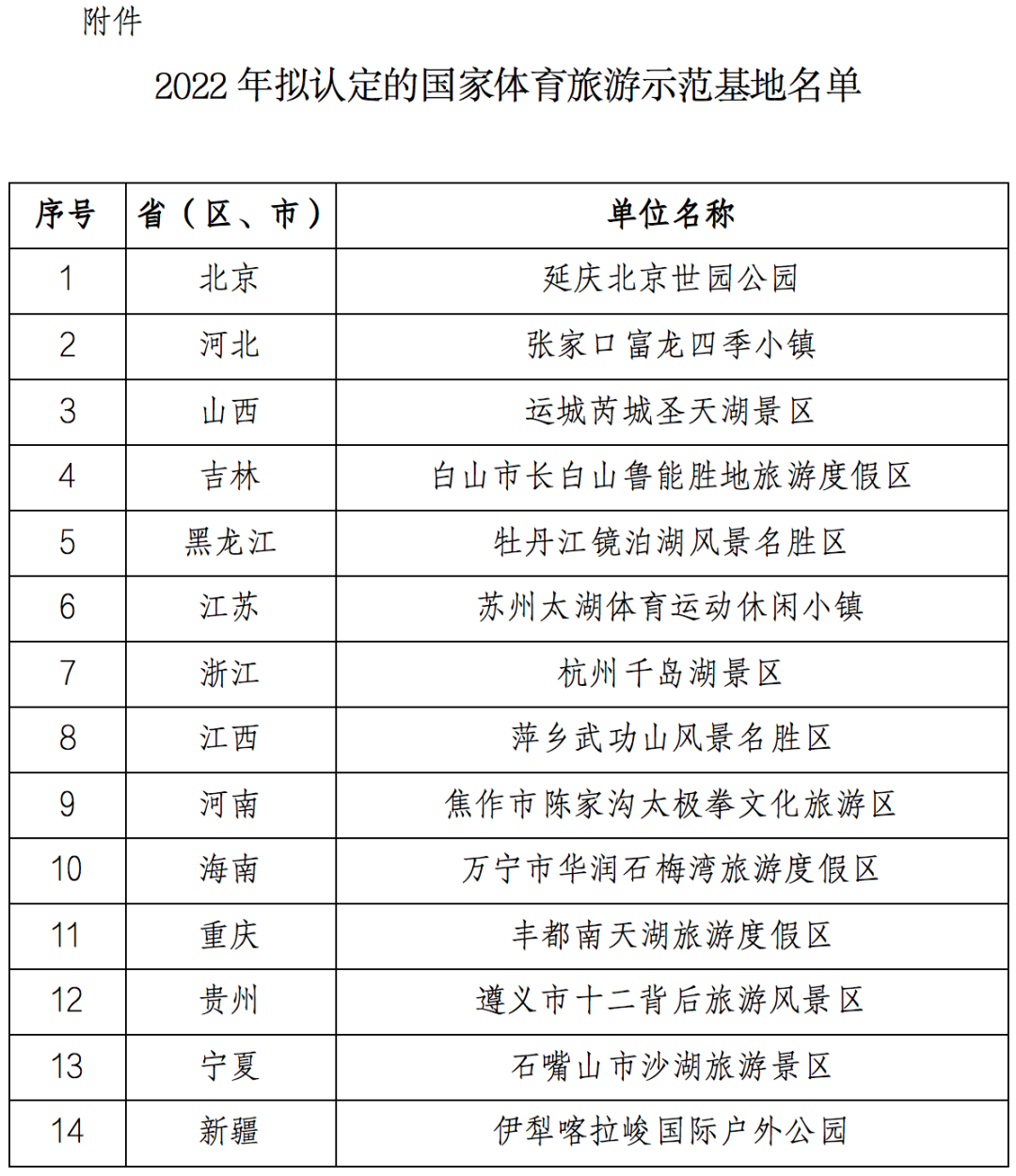 近日,体育总局办公厅、文化和旅游部办公厅联合发布《关于拟认定北京世园公园等14家单位为国家体育旅游示范基地的公示》,全文如下——