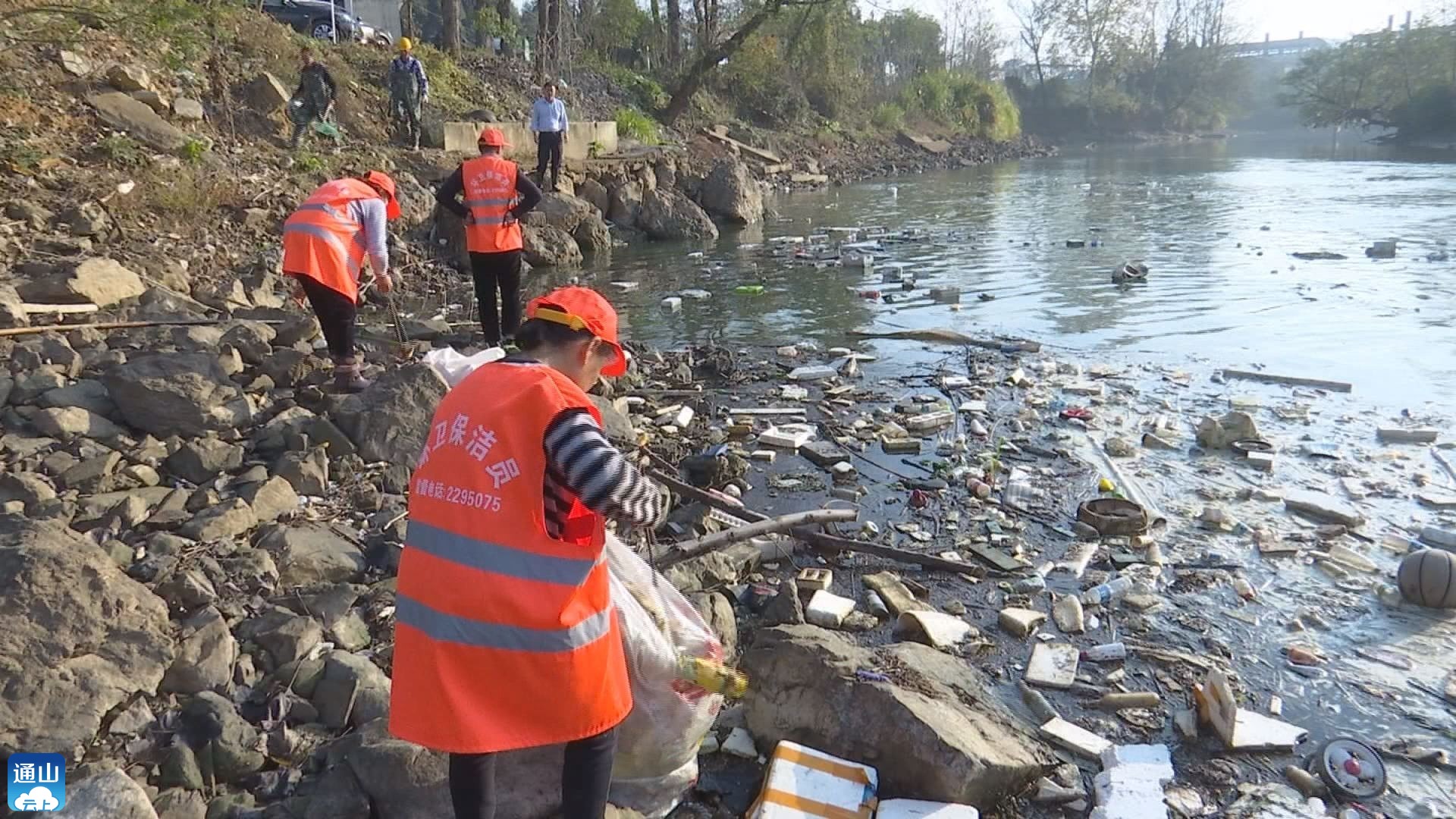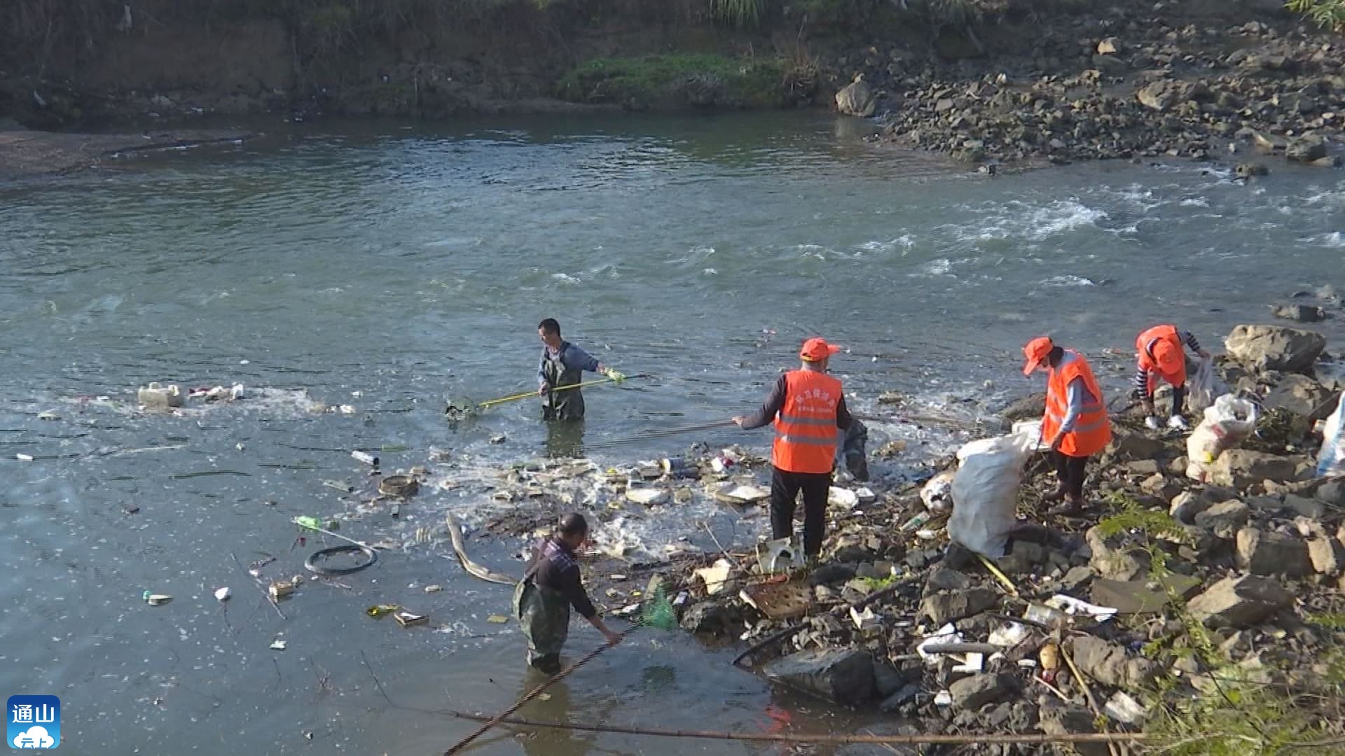 大路乡政府副乡长王翠平说:今天我乡组织各村的保洁员、志愿者以及专业的打捞队伍对通羊河上游下朗河段河面漂浮垃圾进行整治。
